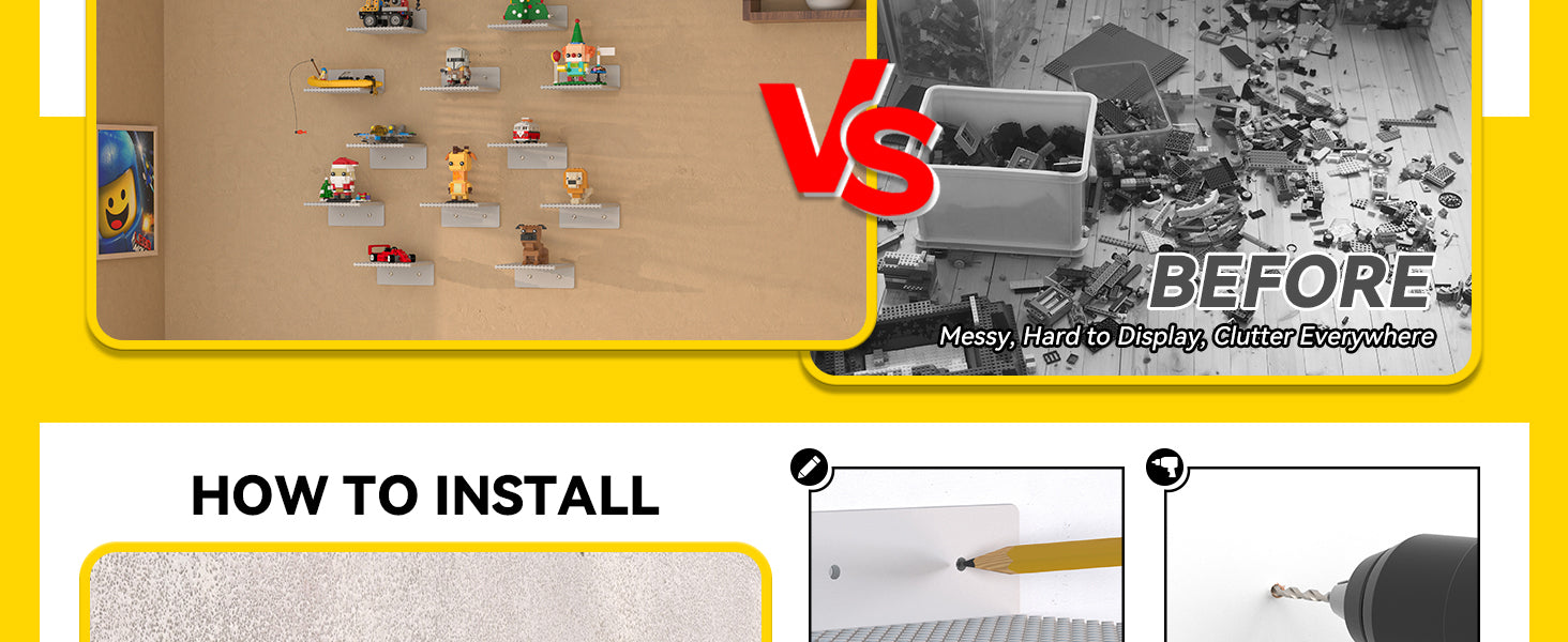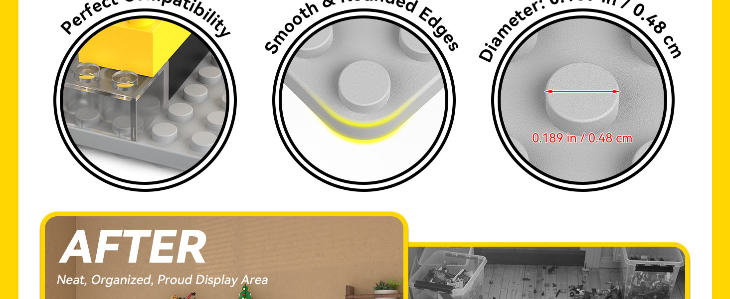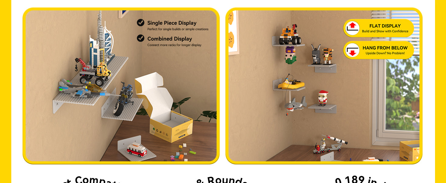 Each 5 x 5.5 inch floating shelves comes with a dual-sided 16x17 stud baseplate with 0.19 inches (4.8mm) studs, compatible with all standard LEGO bricks and other compatible brands. Perfect for small to medium-sized creations, it keeps your builds secure—no slipping or tilting. Plus, the best part: you can even attach bricks to the underside without worrying about them falling off.